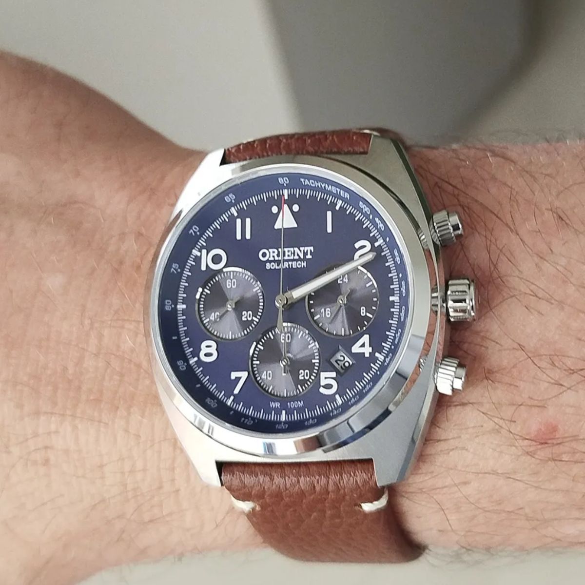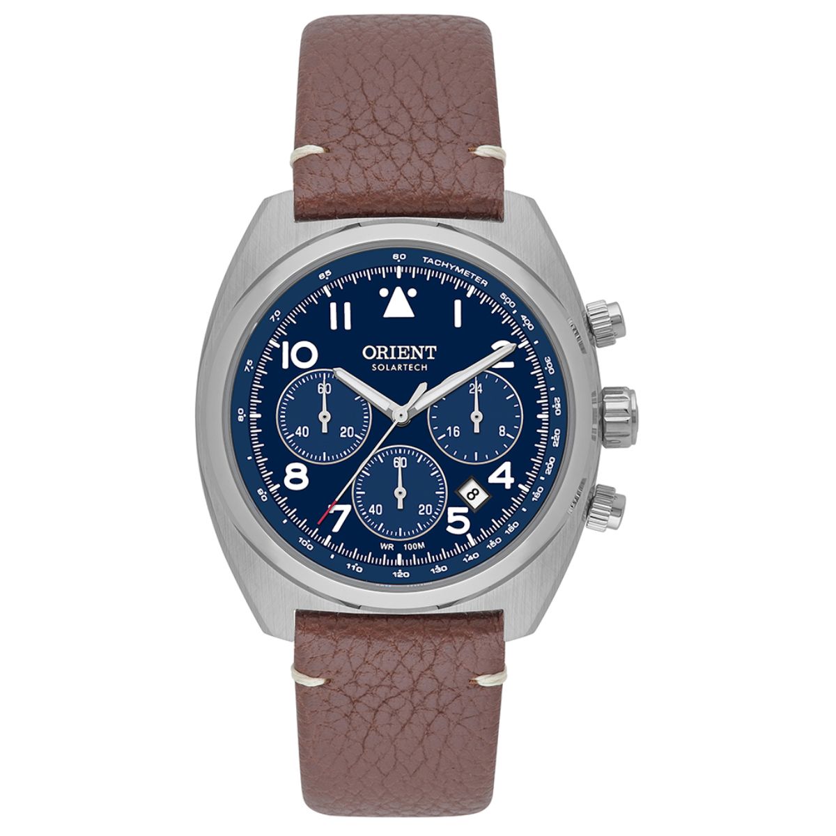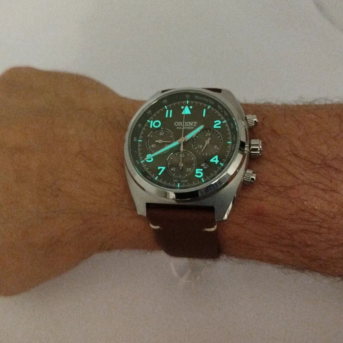 Funções: solartech com autônomia de 6 meses, taquímetro, indicador am/pm, calendário, mostrador em camadas