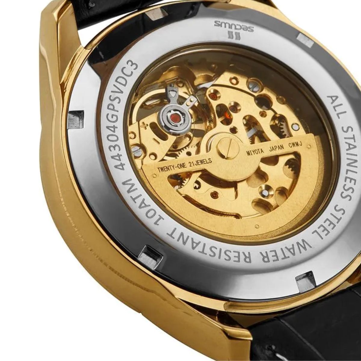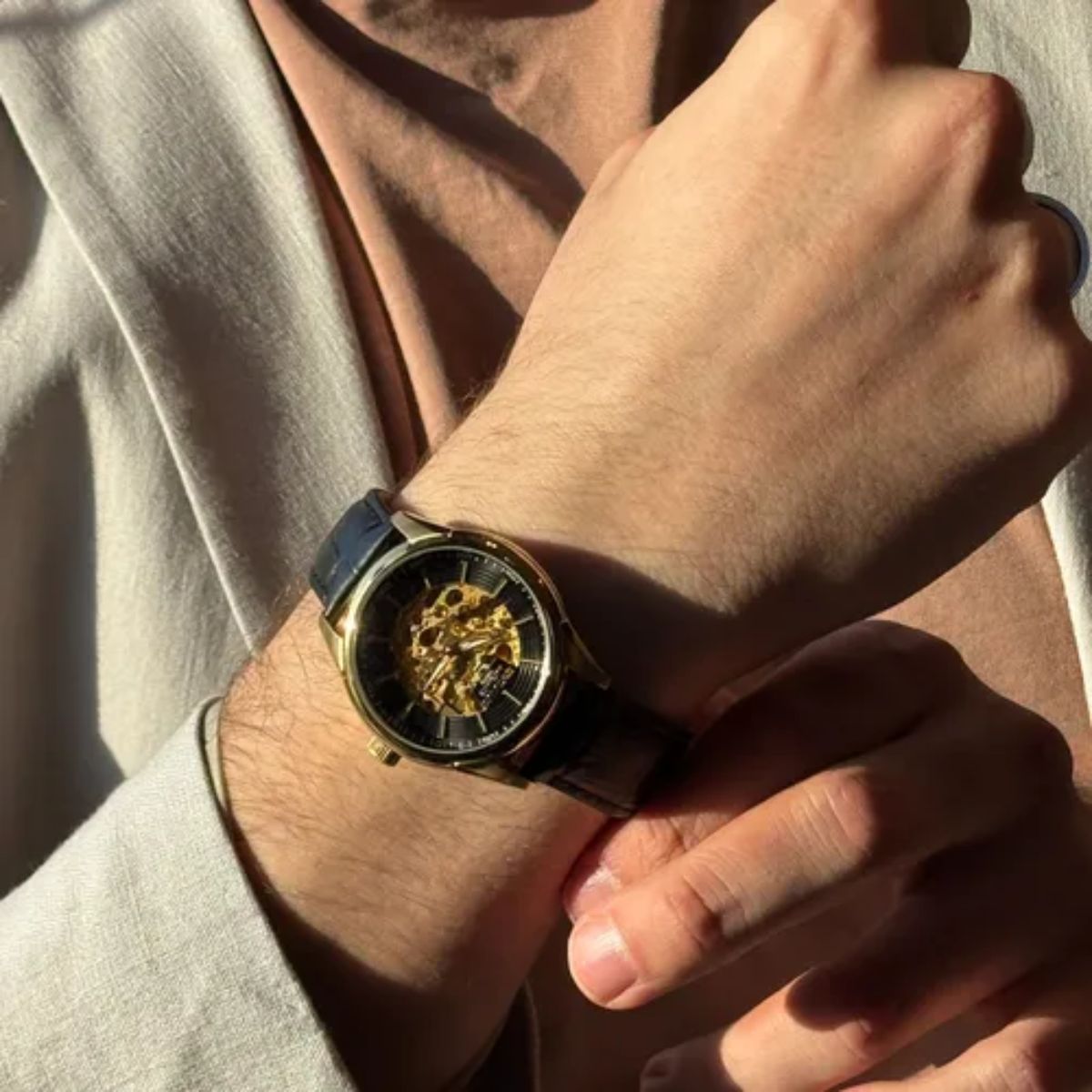 O grande destaque é seu magnífico mostrador SKELETON, uma janela para o complexo e hipnotizante maquinário automático. Observe o balanço em movimento, as engrenagens trabalhando em perfeita harmonia a cada segundo.