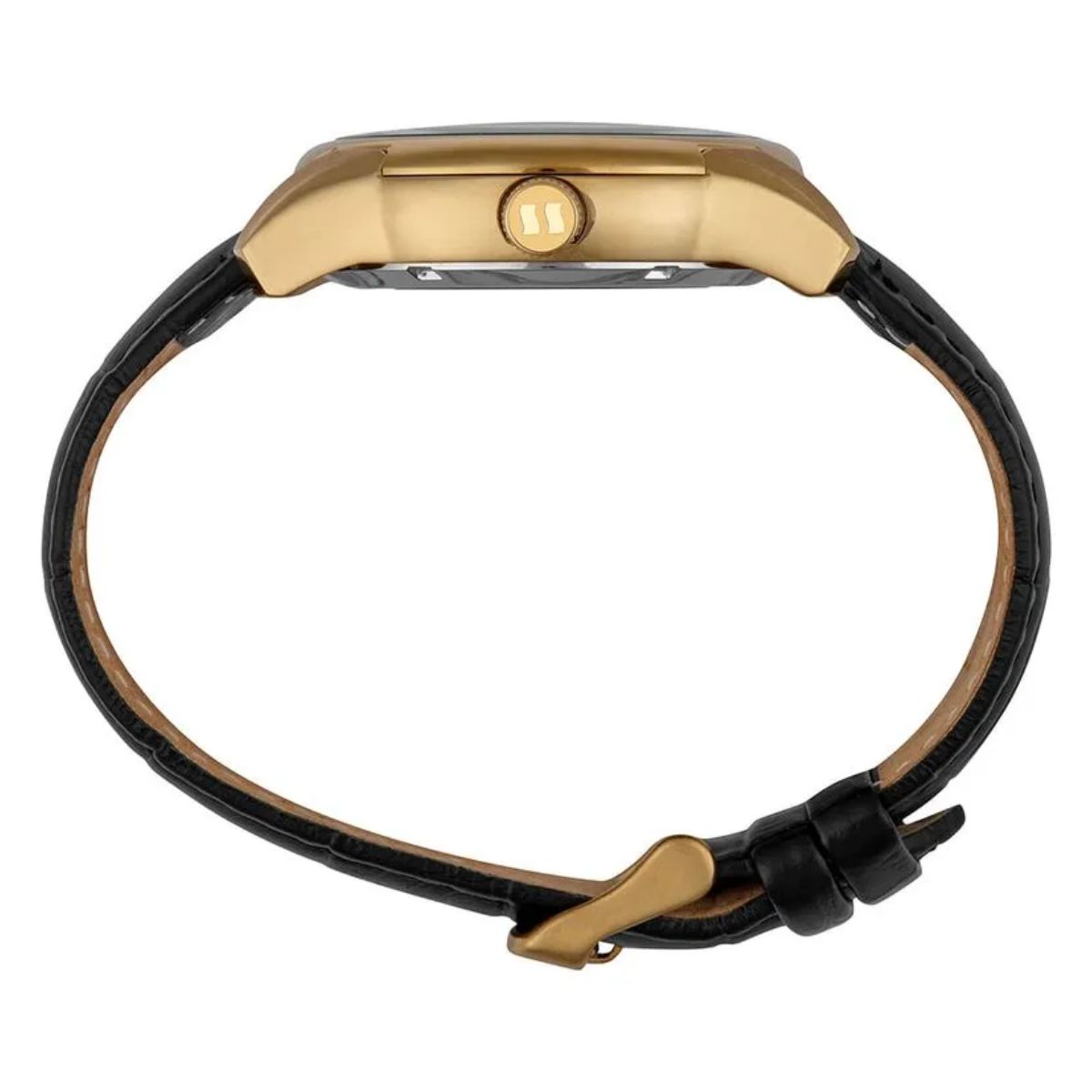 A pulseira em couro possui fecho borboleta com botões laterais, garantindo encaixe firme e confortável.