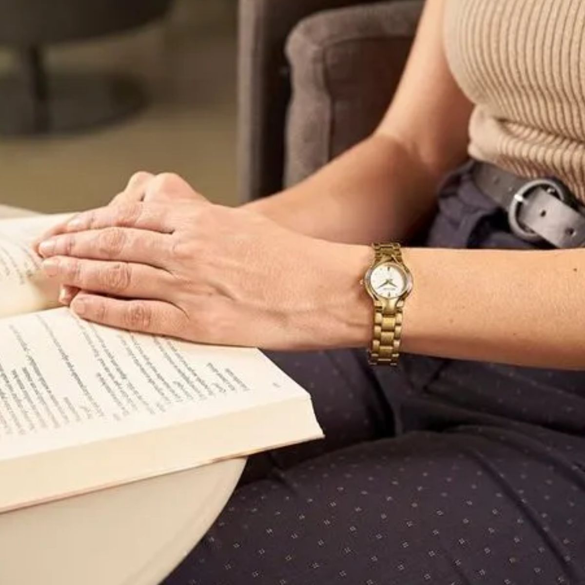 Este relógio analógico de estilo clássico é uma peça de estilo. Com um visor branco que destaca seus marcadores delicados, ele é ideal para quem aprecia um design sutil e refinado. A caixa em metal especial mede apenas 2,4 cm, proporcionando um caimento delicado no pulso. A folheação dourada adiciona um toque de sofisticação, enquanto a pulseira trabalhada em aço, com fecho por acionamento lateral, garante conforto e segurança. Este relógio é a escolha perfeita para completar looks tanto formais quanto casuais, adaptando-se bem a todos os tamanhos de pulso.