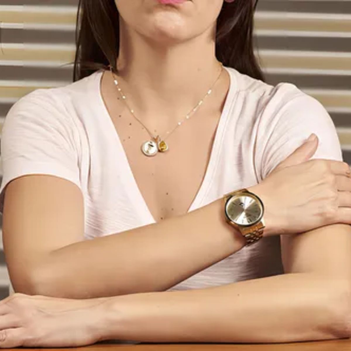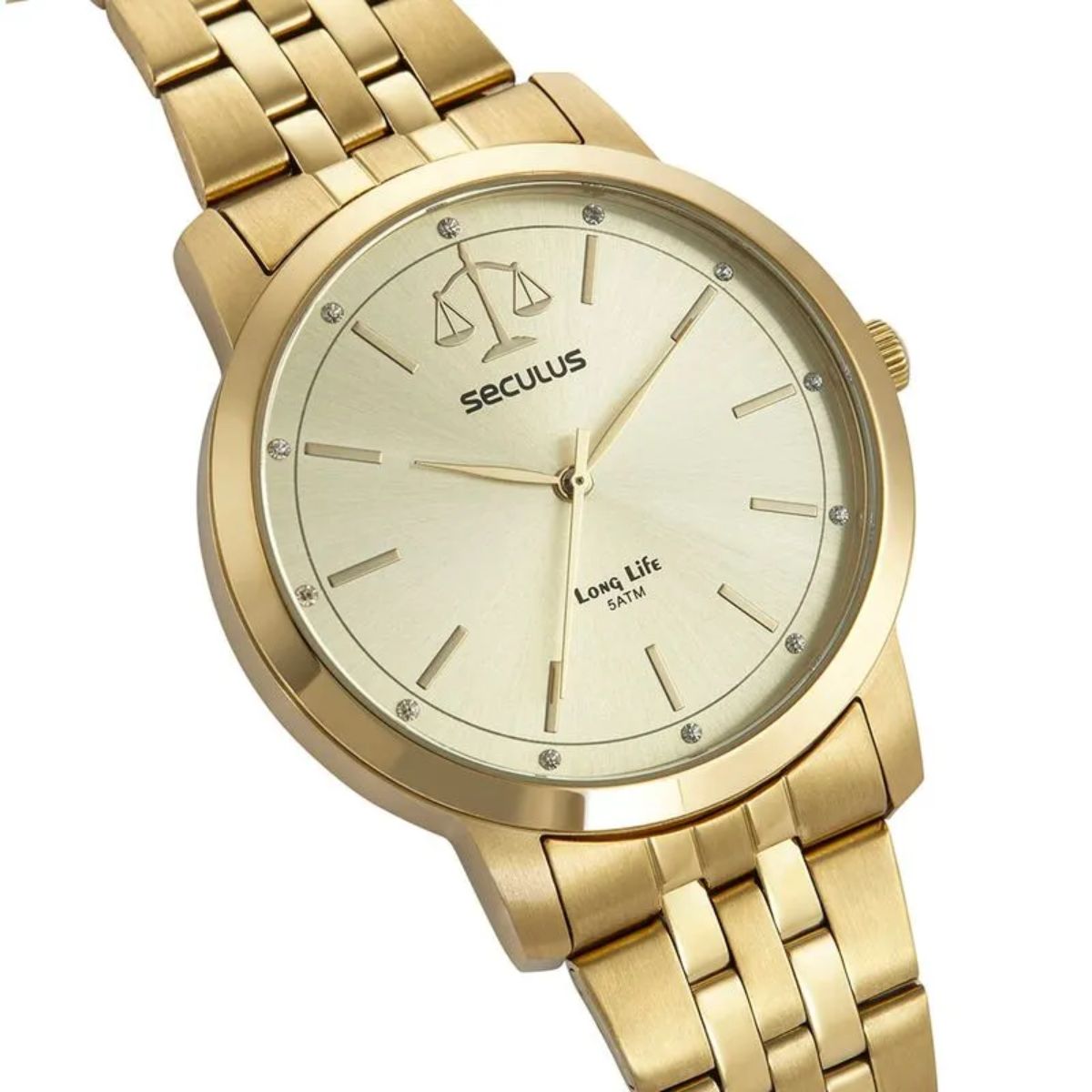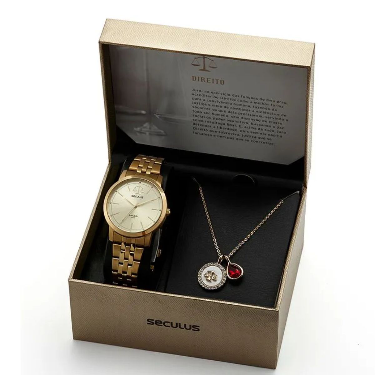 Este kit é uma ótima opção para presentear os formados em direito. Vem com um relógio analógico dourado todo em aço, com ícone do direito no mostrador. Como brinde, acompanha um colar dourado com dois pingentes, um em pedraria e outro com o ícone da profissão. Esse relógio possui a caixa em 4 cm de tamanho.