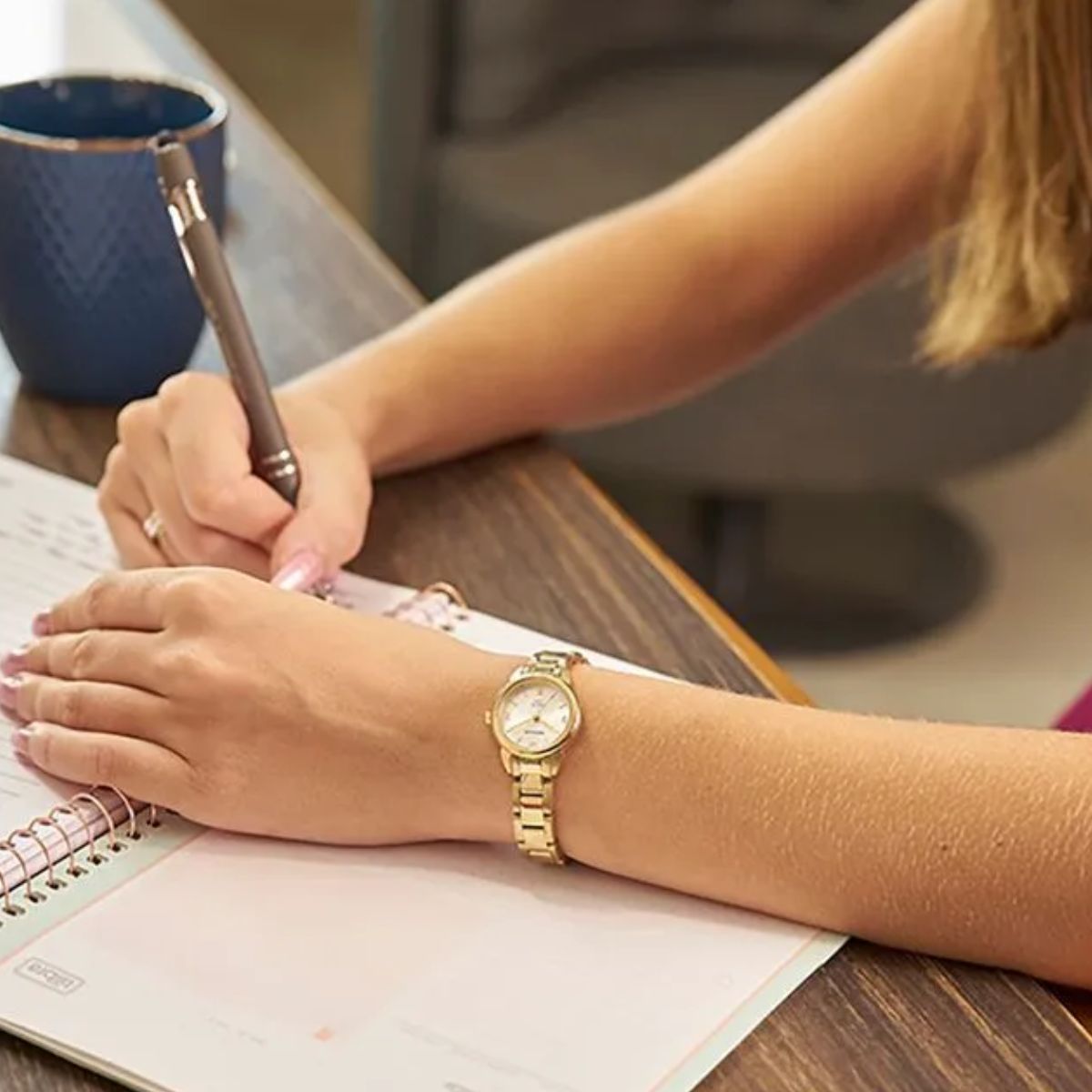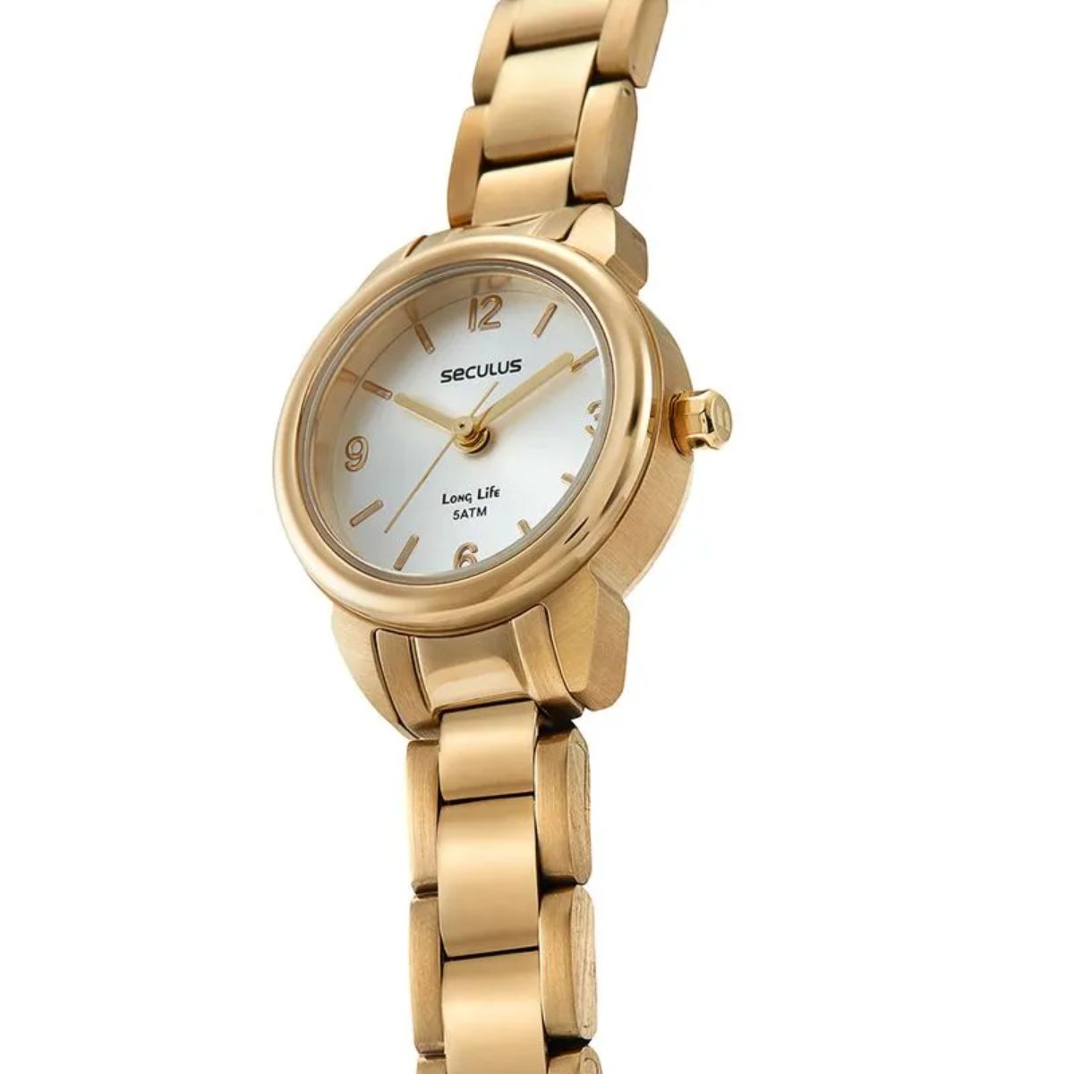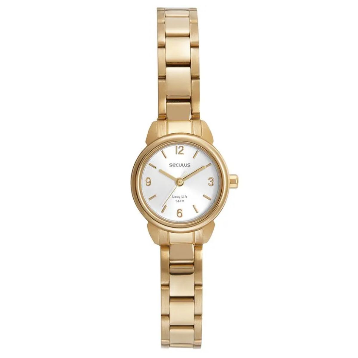 Relógio analógico todo em aço, visor prata com marcadores numéricos e ponteiros em filetes na cor dourada. A pulseira de largura fina possui fecho por trava de pressão. Esse relógio possui a caixa em 2,2 cm de tamanho.