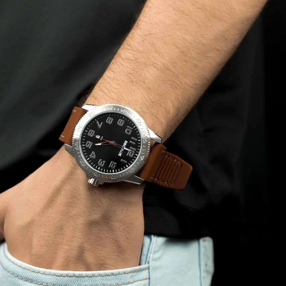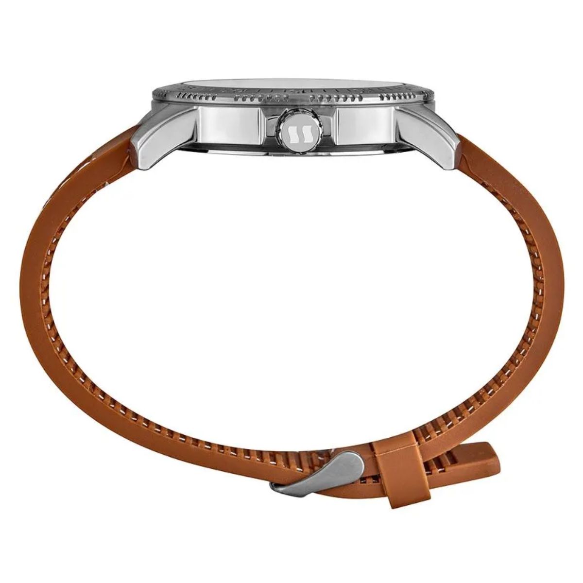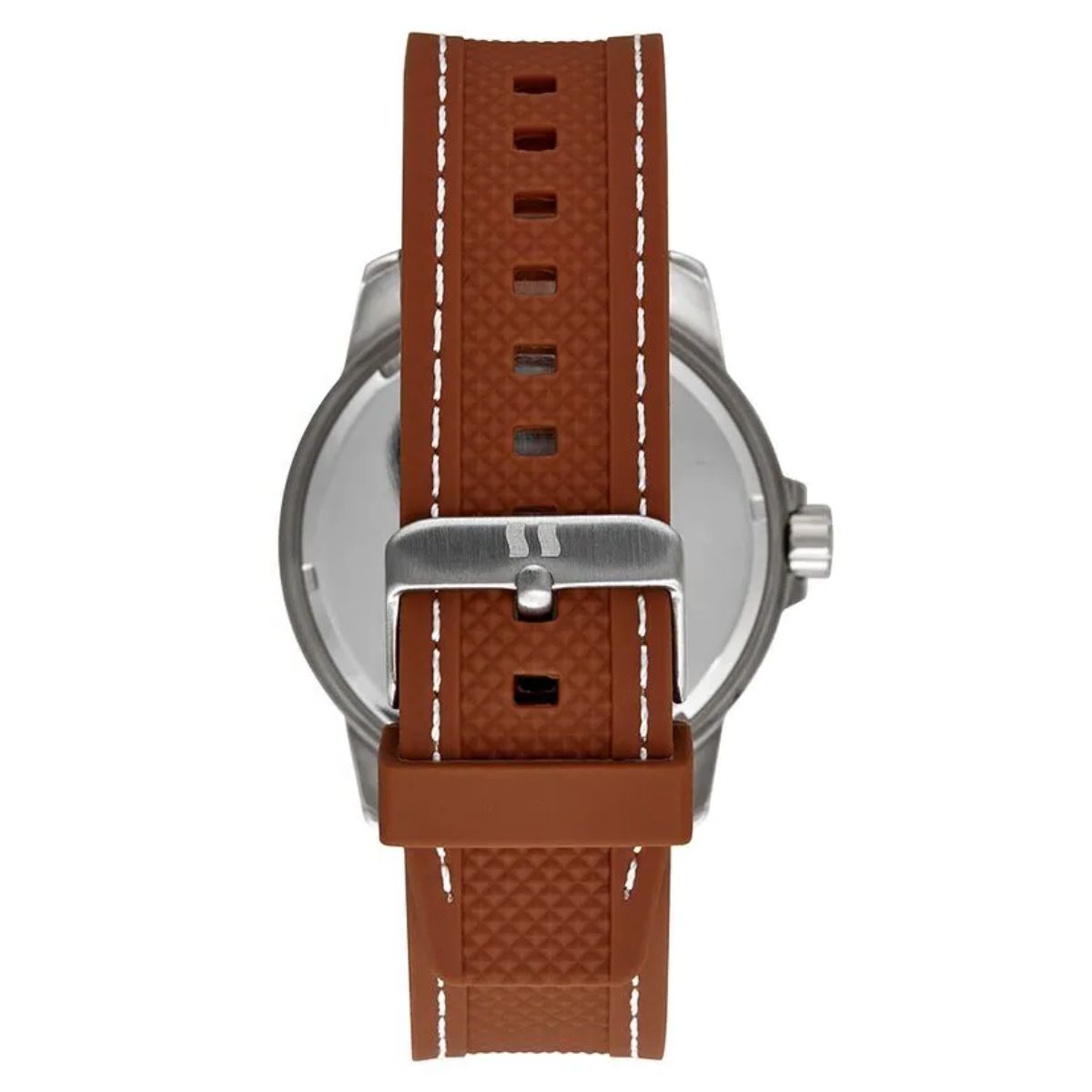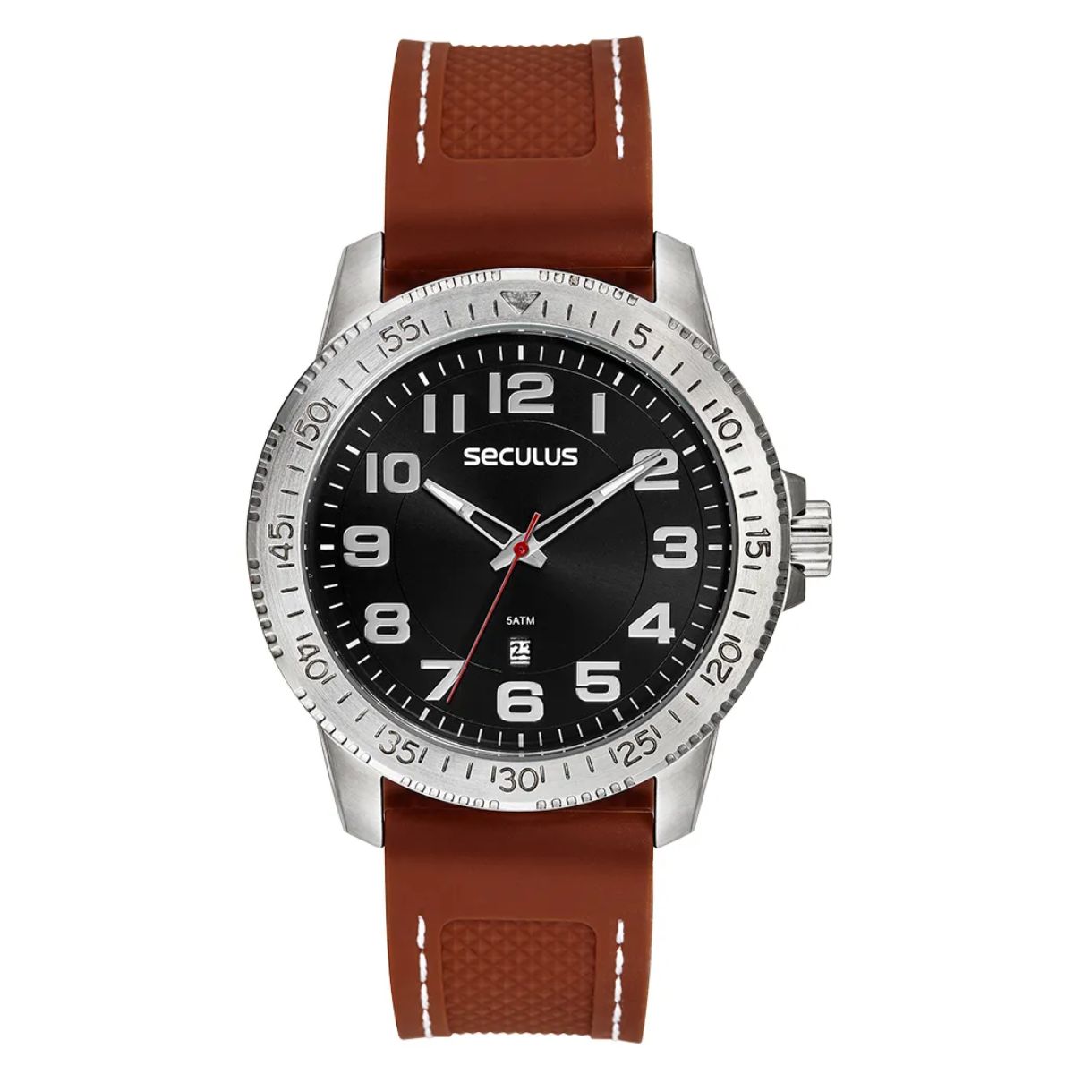 Este relógio analógico possui uma caixa em aço de 4,8 cm de diâmetro, adequada para todos os tamanhos de pulso. Destaca-se pela numeração completa no mostrador e pela pulseira em silicone com pespontos, que oferece conforto e estilo. O modelo também possui marcações em baixo relevo na catraca, adicionando um toque de sofisticação ao design.